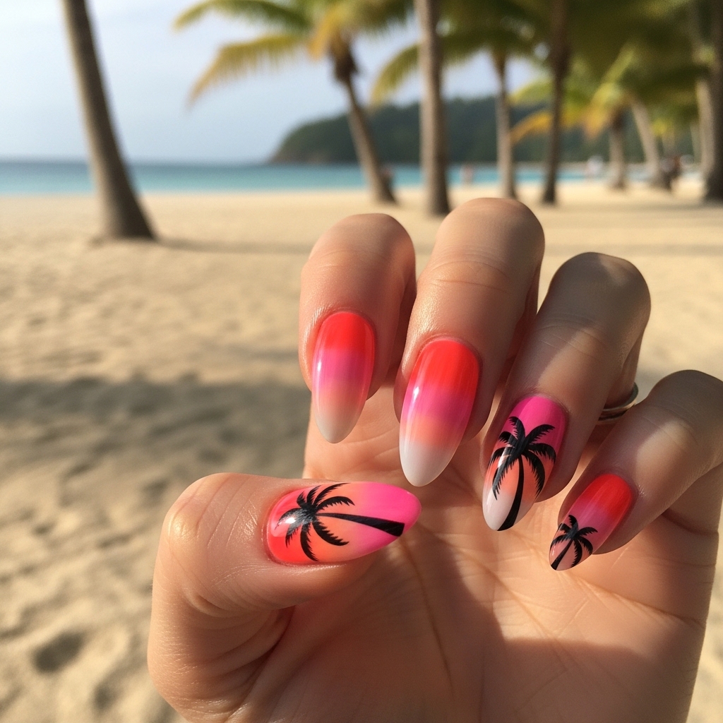 Palm tree silhouette nails feature soft gradient bases inspired by tropical sunsets, blending shades like coral, peach, and warm pink. Over this colorful backdrop, delicate black palm tree silhouettes are added to one or two accent nails, creating a calm, scenic effect. The rest of the nails often remain in coordinating tones to keep the look balanced.