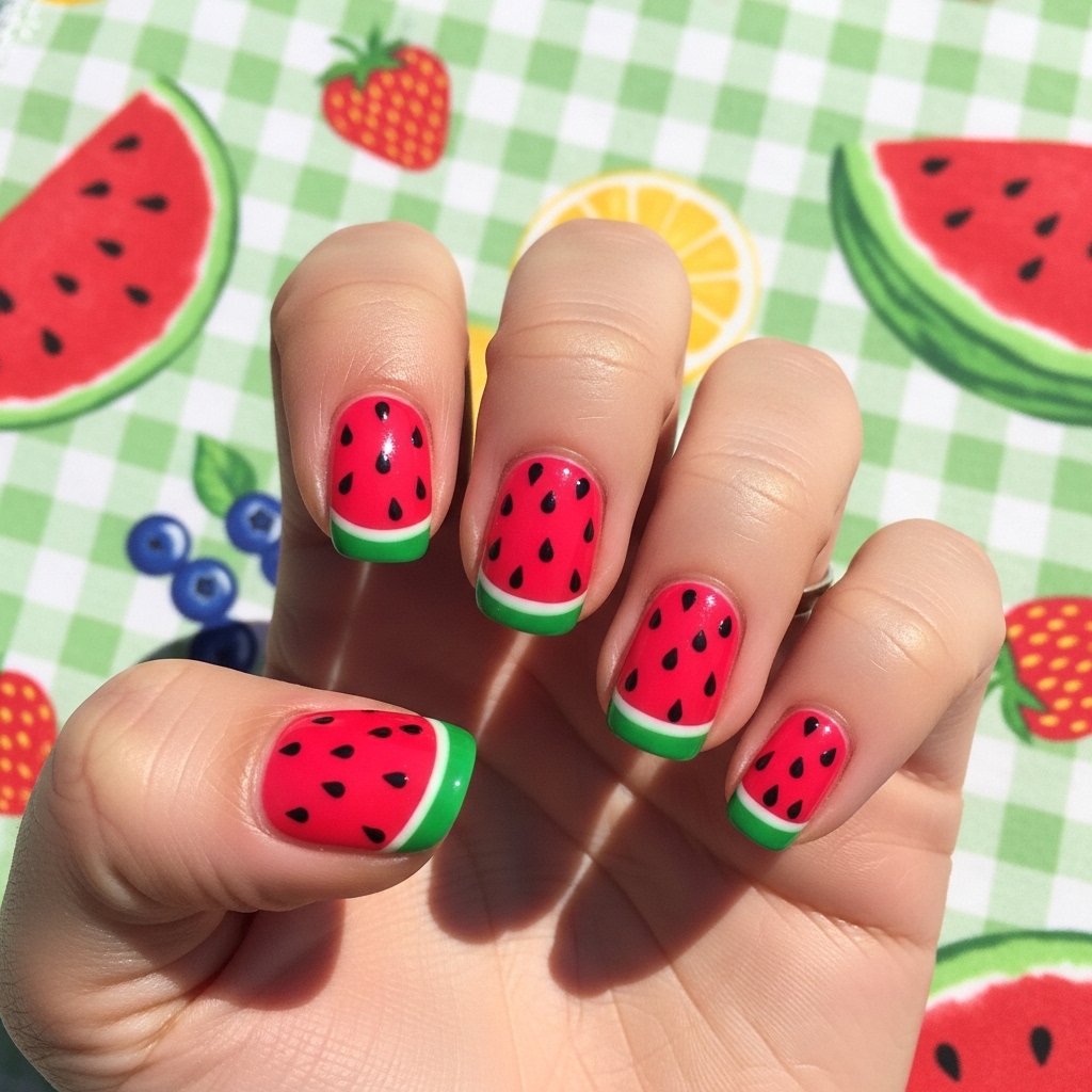 This playful design includes vibrant pink or red nails paired with green-tipped accents and tiny black seed details to mimic watermelon slices. Usually, one or two nails feature the full fruit design, while others stay in bold complementary shades.