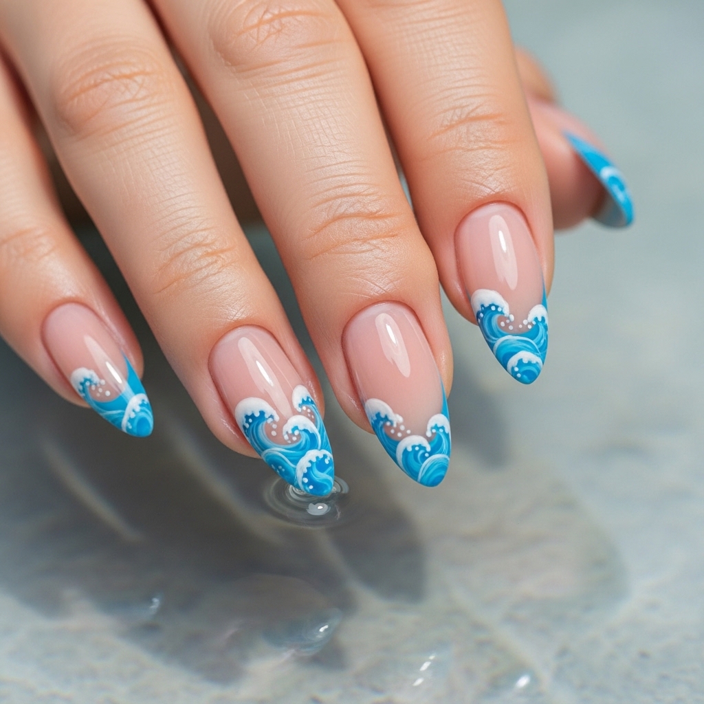 Ocean wave French tips give a modern twist to the classic manicure by replacing traditional tips with flowing blue and turquoise wave designs. The base remains sheer or nude, creating a clean and airy appearance.