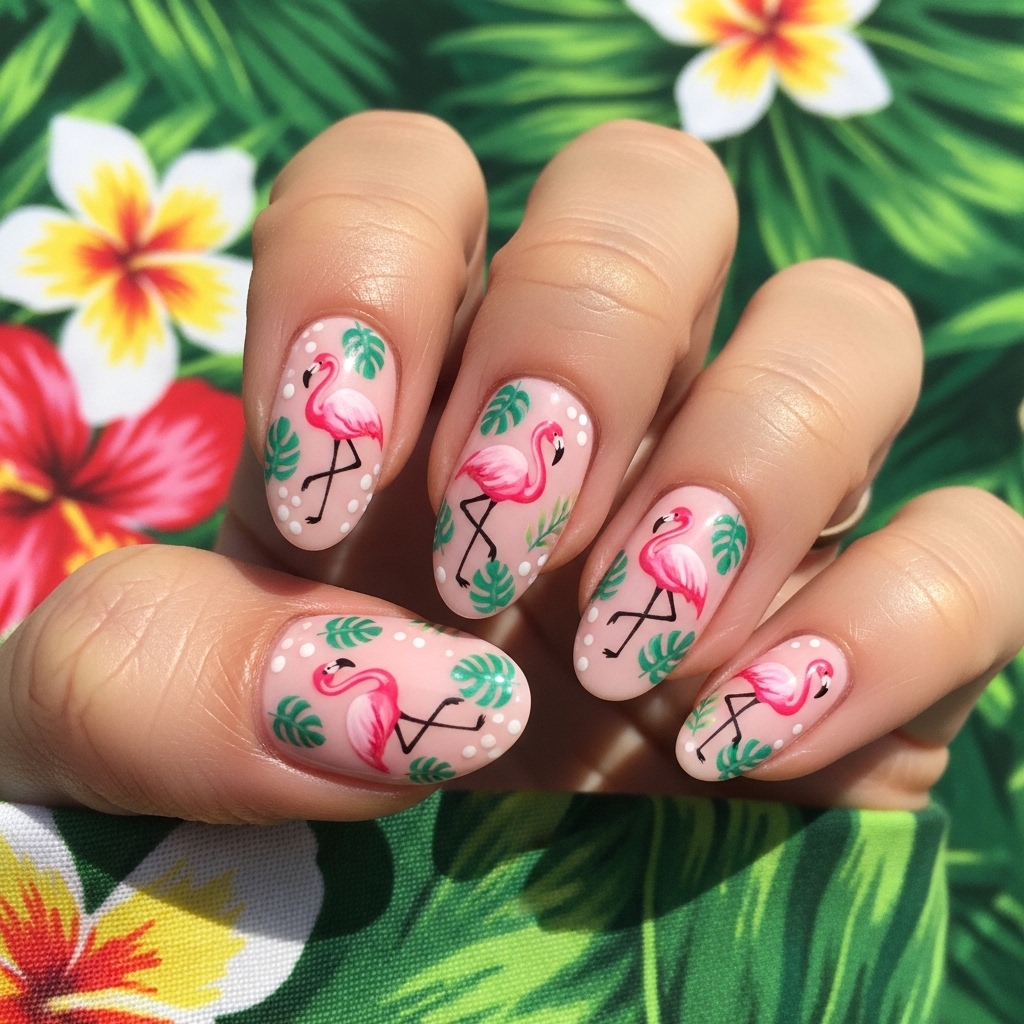 Tropical flamingo nails combine soft pink bases with hand-painted flamingo designs and subtle green leaf accents. The artwork is typically placed on accent nails, allowing the overall look to remain balanced.