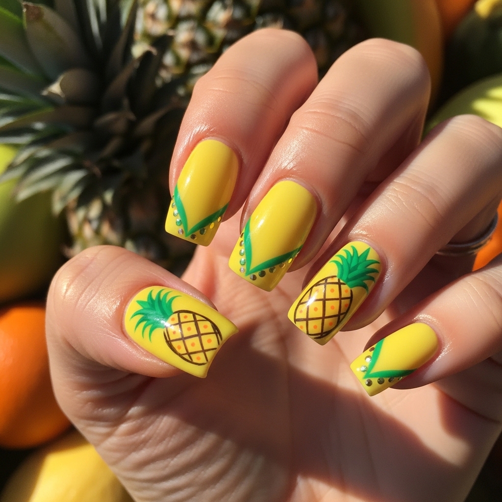 Pineapple paradise nails feature bright yellow tones paired with green leafy accents and small pineapple illustrations. Some nails showcase detailed fruit art, while others stay solid for contrast.