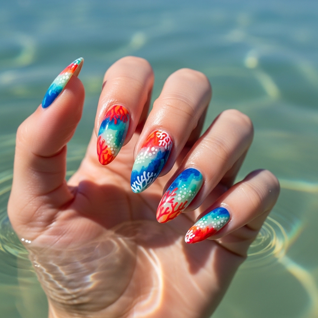 Inspired by underwater beauty, this design blends coral, orange, and blue tones with abstract patterns that resemble reef textures. The look is fluid and artistic, with soft transitions between colors.