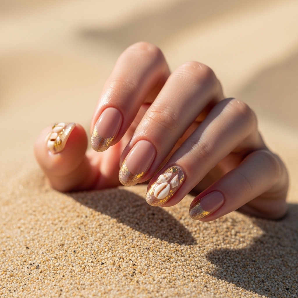 This elegant design uses soft nude and beige tones enhanced with golden shimmer and tiny seashell accents. The look is subtle, evoking warm sandy beaches and coastal textures.