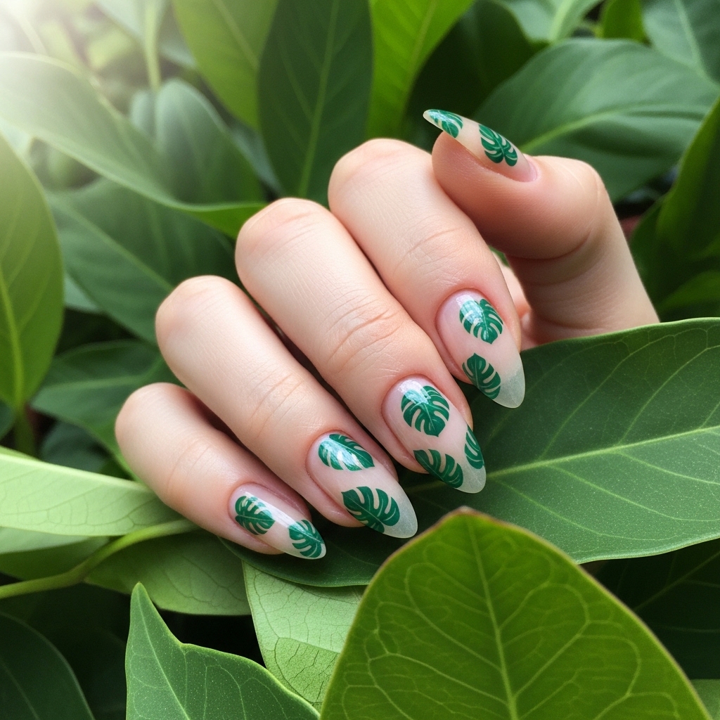 Monstera leaf nails feature soft green leaf patterns over neutral or pastel bases. The design feels fresh and minimal compared to more vibrant tropical styles.