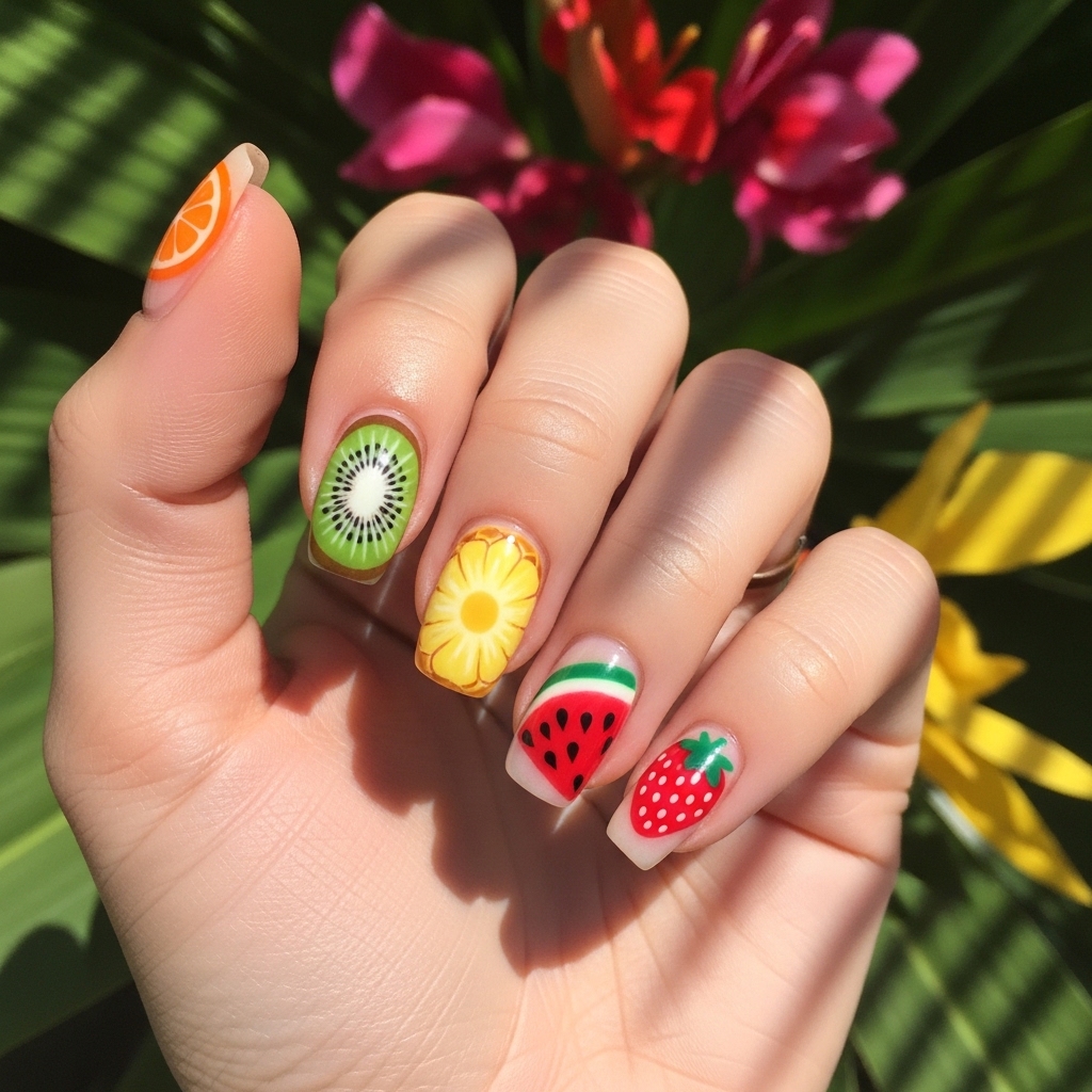 This playful design features a mix of fruit-inspired nail art including oranges, kiwis, and pineapples across different nails. Each nail showcases a unique design, creating a vibrant and lively set.
