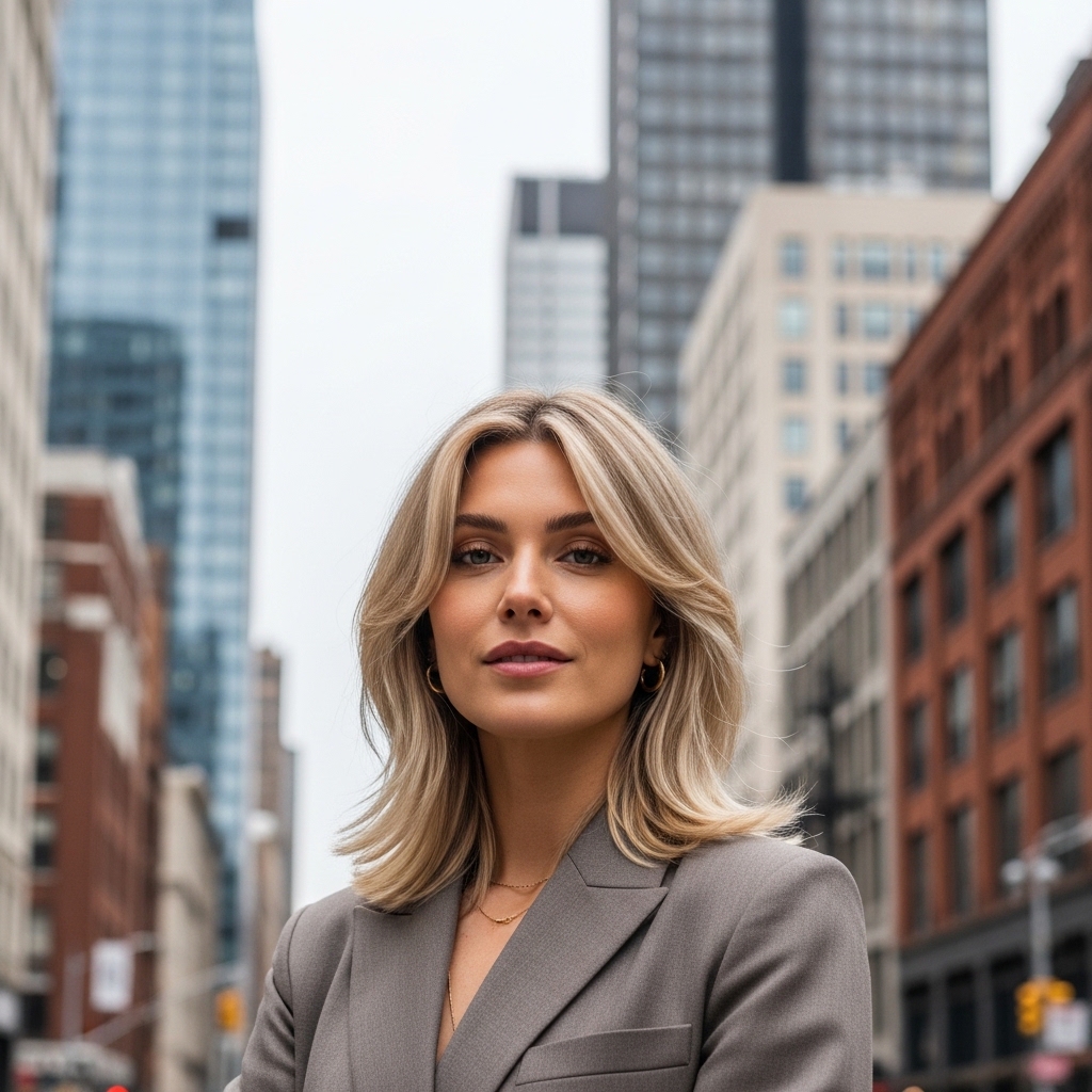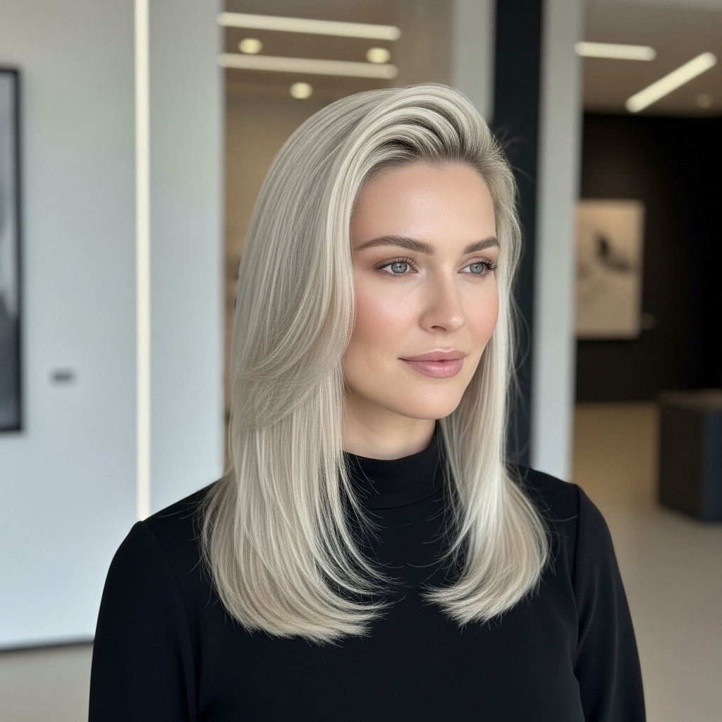 This soft blonde shade with creamy undertones is styled in voluminous layers that add body and movement. The airy texture makes the look feel light and summery, perfect for daytime wear or social gatherings. The color enhances brightness without appearing harsh, making it both flattering and easy to maintain.