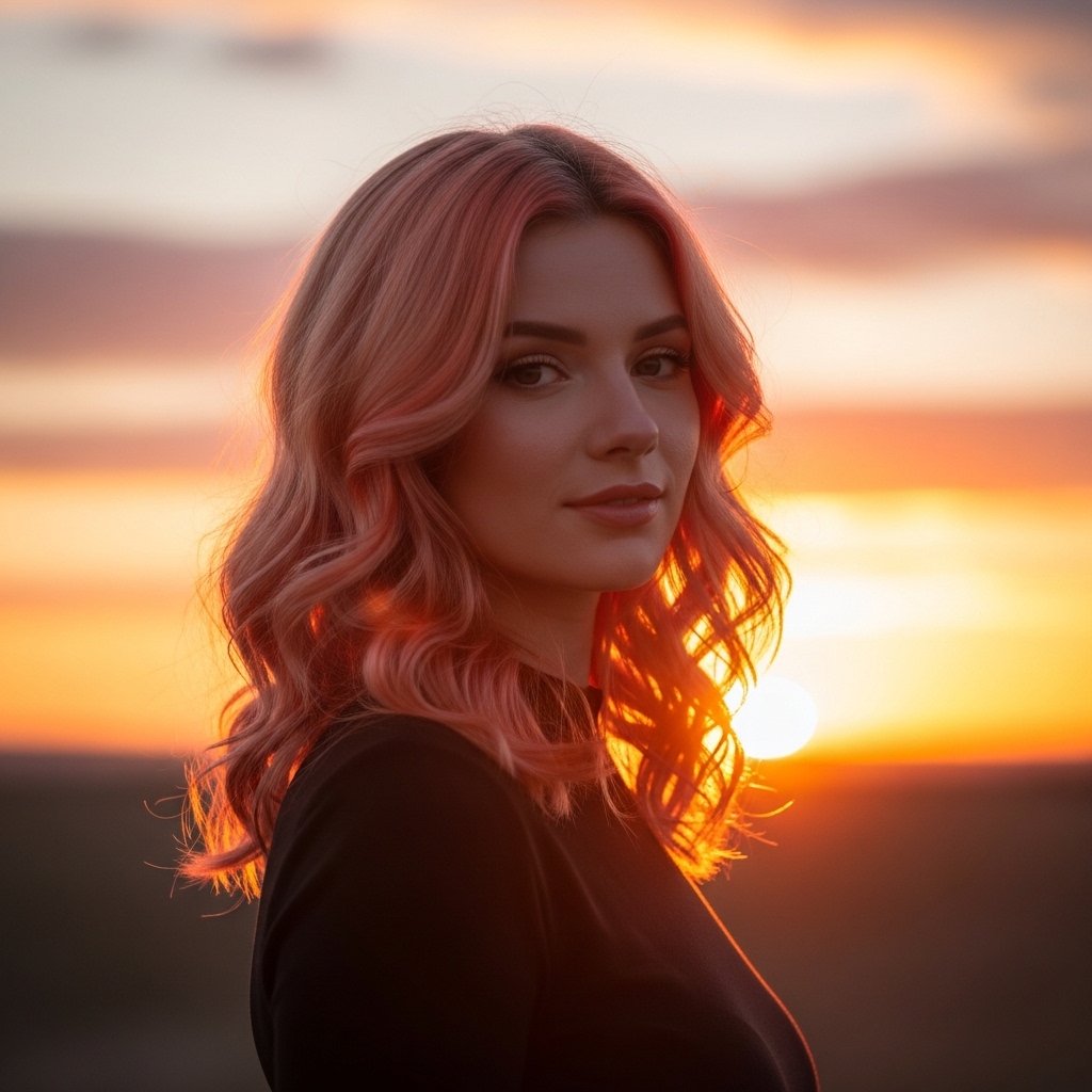 A blend of peach, coral, and soft pink tones creates a sunset-inspired color that feels warm and vibrant. Styled in loose curls, this look enhances the dimensional effect of the color. It is perfect for summer evenings, outdoor events, or creative settings where a touch of color adds personality. The soft curls keep the style relaxed, balancing the bold tones with an easygoing finish.
