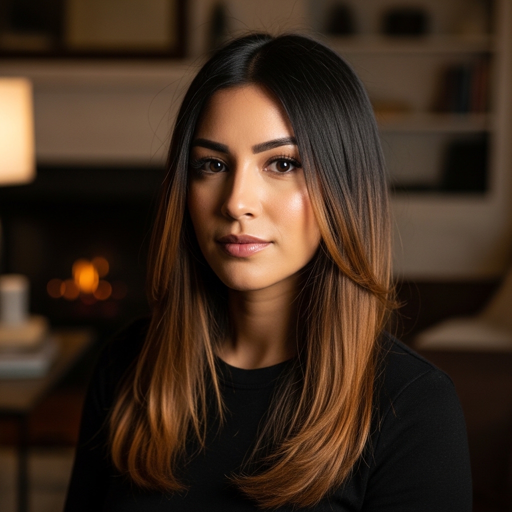 Caramel highlights woven through a darker base create a ribbon-like effect that adds warmth and shine. The glossy finish enhances the richness of the tones, making the hair appear healthy and vibrant. This look is versatile enough for both professional and casual settings, offering a balance between subtle enhancement and noticeable style.