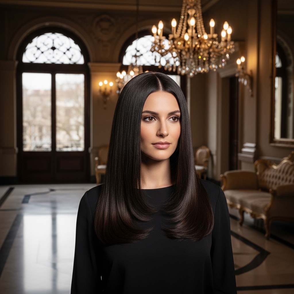 Rich espresso tones with a high-gloss finish create a sleek and sophisticated appearance. Styled straight, this look emphasizes shine and smoothness, making it ideal for evening events or formal occasions. The deep color adds intensity while remaining timeless, and the polished texture ensures a comfortable and manageable style.